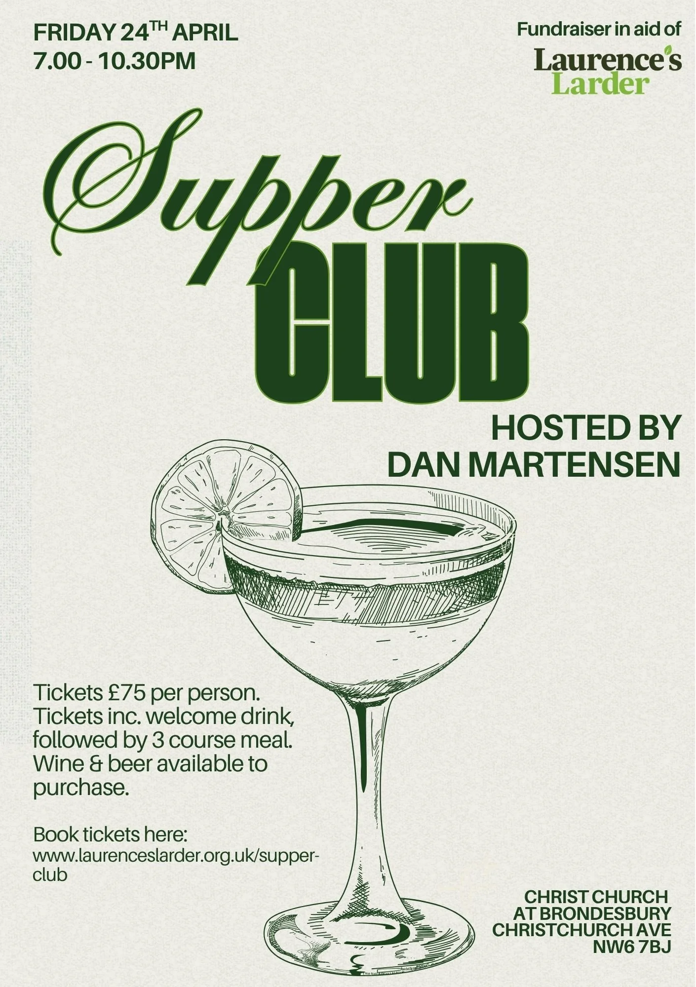 We'd like to invite you to the first Friends of Laurence's Larder Supper Club of 2026, on Friday 24th April from 7.00pm.